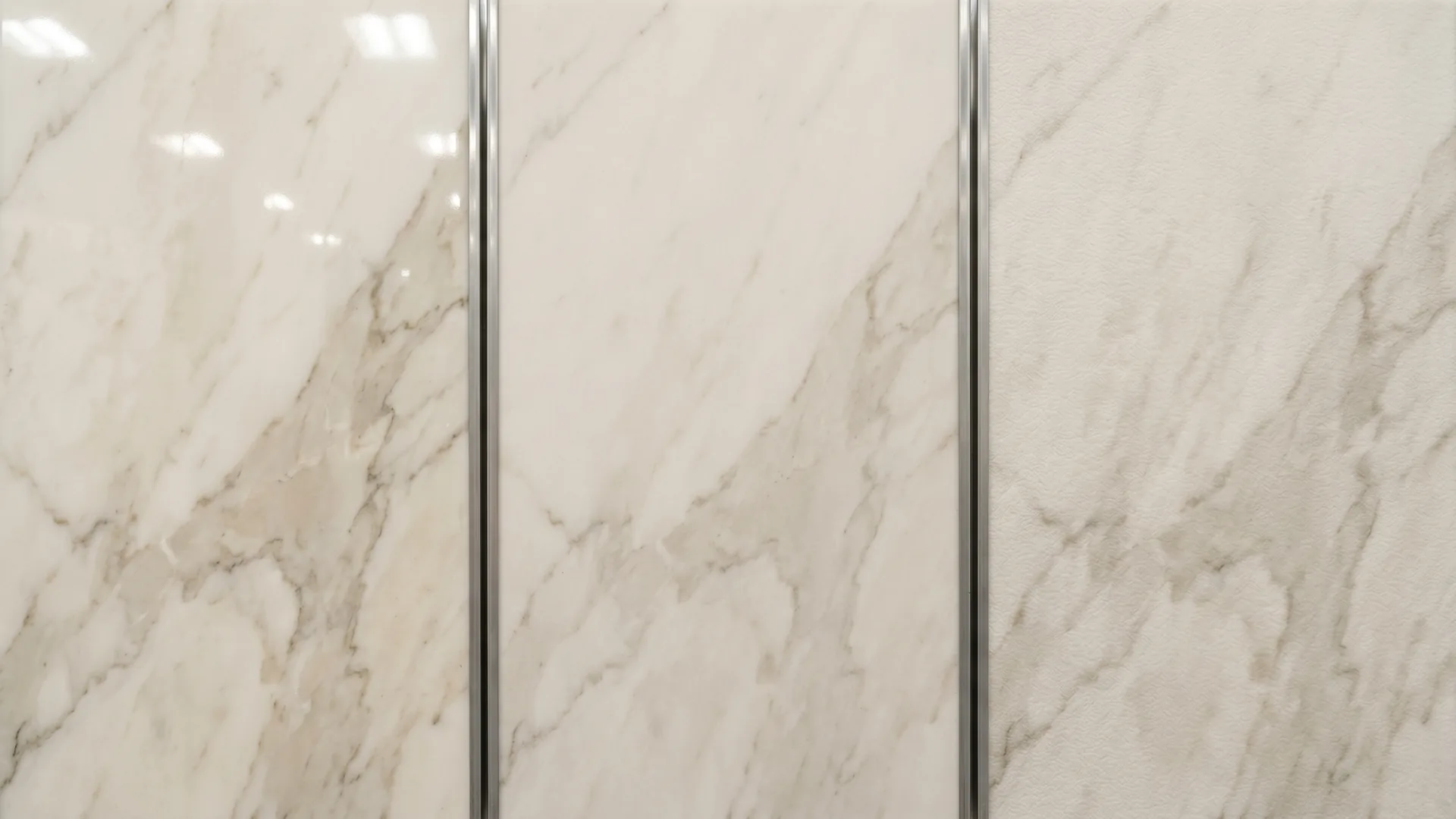 Same slab, three finishes. Polished (left) · honed (center) · leathered (right).