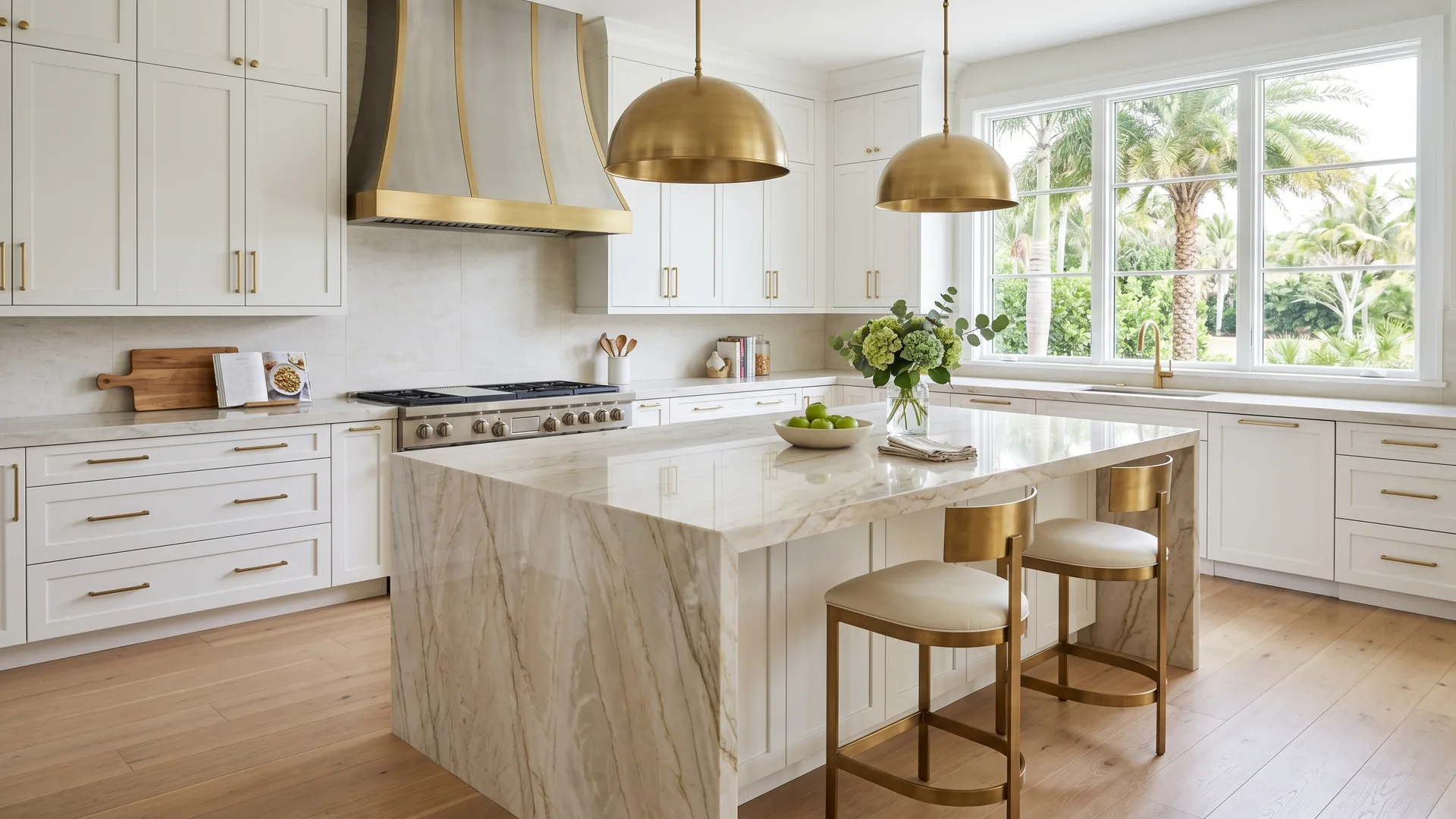 It works with the current aesthetic. White shaker cabinets, brass hardware, warm wood floors, palm trees outside the window. Taj Mahal fits that exact picture. Carrara marble used to fill that slot, but Carrara runs colder — more grey than beige. Taj Mahal's warmth works harder for Florida light.